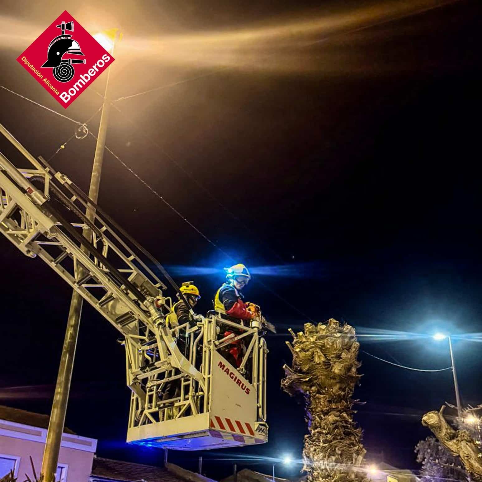 Bomberos de Orihuela acudieron a retirar una palmera que se inclinó debido a los fuertes vientos en la pedanía de Hurchillo, según informó el Consorcio Provincial de Bomberos a través de sus redes sociales. La alerta se produjo el sábado a las 18:47 horas en la Calle El Molino de Hurchillo.