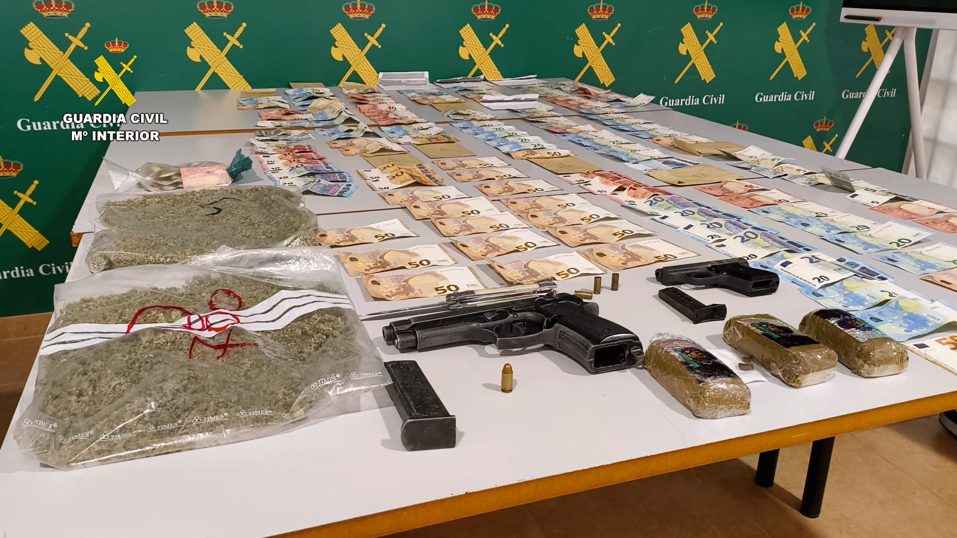 En el registro domiciliario se incautó más de medio kilo de droga, más de 3.000 euros en metálico y dos pistolas. Los tres hombres fueron detenidos en el propio lugar de los hechos.