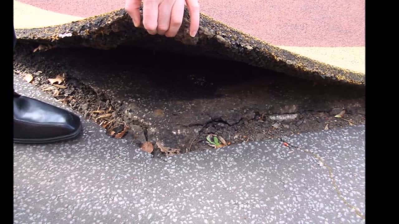 El niño tropezó con una loseta de caucho levantada. En lugar de amortiguar su caída, la superficie endurecida e irregular lo hizo precipitarse hacia adelante, abriéndose la barbilla.