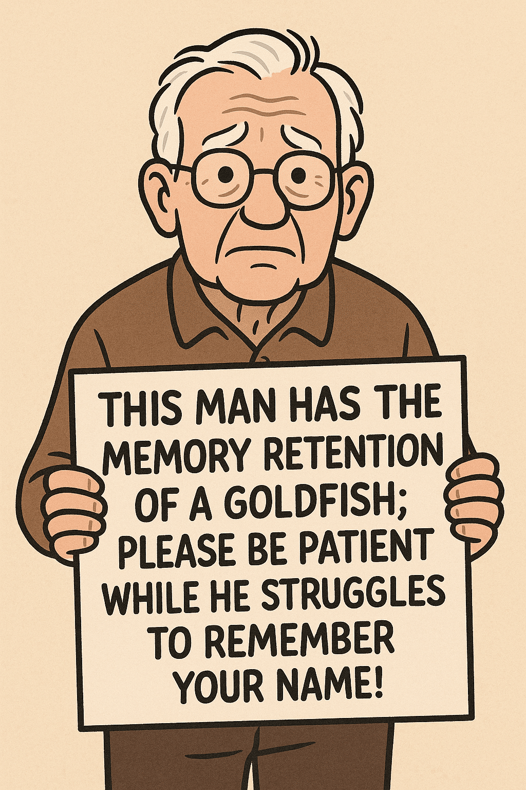 Mi [pobre] excusa es que conozco a tanta gente de diferentes ámbitos de mi vida que no se puede esperar que los recuerde a todos … pero no cuela. Cuando era dueño del pub Paddy’s Point en España, ideé un plan para disculparme de antemano. Sobre la barra tenía un póster inflado de una foto mía mirando confundido, (¡no hay problema en encontrar eso!) con la leyenda. ‘¡ESTE HOMBRE TIENE LA MEMORIA DE UN PEZ DORADO; POR FAVOR TEN PACIENCIA MIENTRAS LUCHA POR RECORDAR TU NOMBRE!’ Esto me consiguió algo de simpatía y comprensión … ¡pero no ayudó con el problema subyacente!